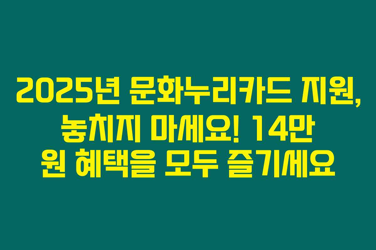 제가 알아본 바로는 2025년 새로운 문화누리카드 지원사업이 시행되며, 지원금이 14만 원으로 인상되었습니다. 기초생활수급자 및 차상위계층을 위해 마련된 이 카드는 이제 더 다양한 문화생활을 경제적 부담 없이 누릴 수 있는 기회를 제공합니다. 아래를 읽어보시면, 이 카드의 사용기한이 정해져 있다는 점과 신청 방법에 대해 자세히 알아보실 수 있을 거예요!