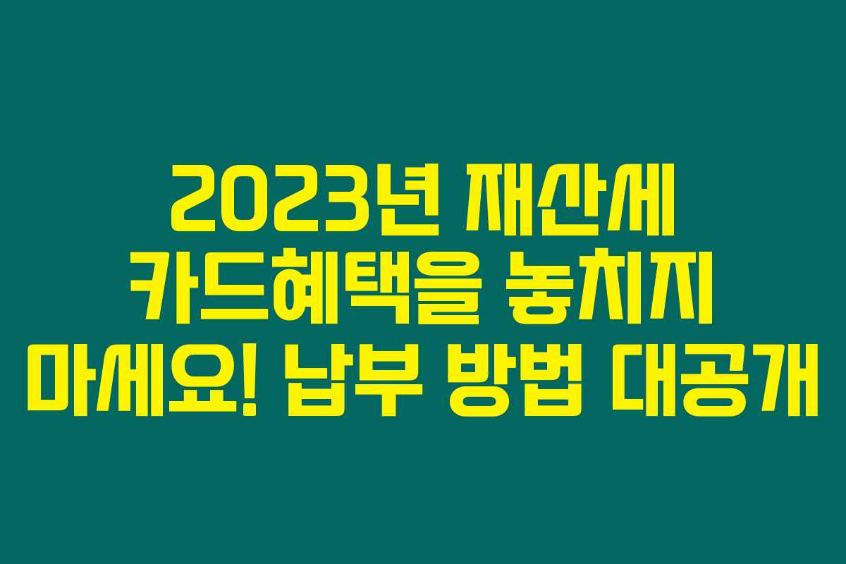 2023년에는 여러 카드사에서 재산세 납부를 장려하기 위해 다양한 혜택을 제공합니다. 재산세를 카드로 납부하면, 무이자 할부와 함께 캐시백, 쿠폰 등을 통해 풍성한 혜택을 누릴 수 있습니다. 예를 들어: