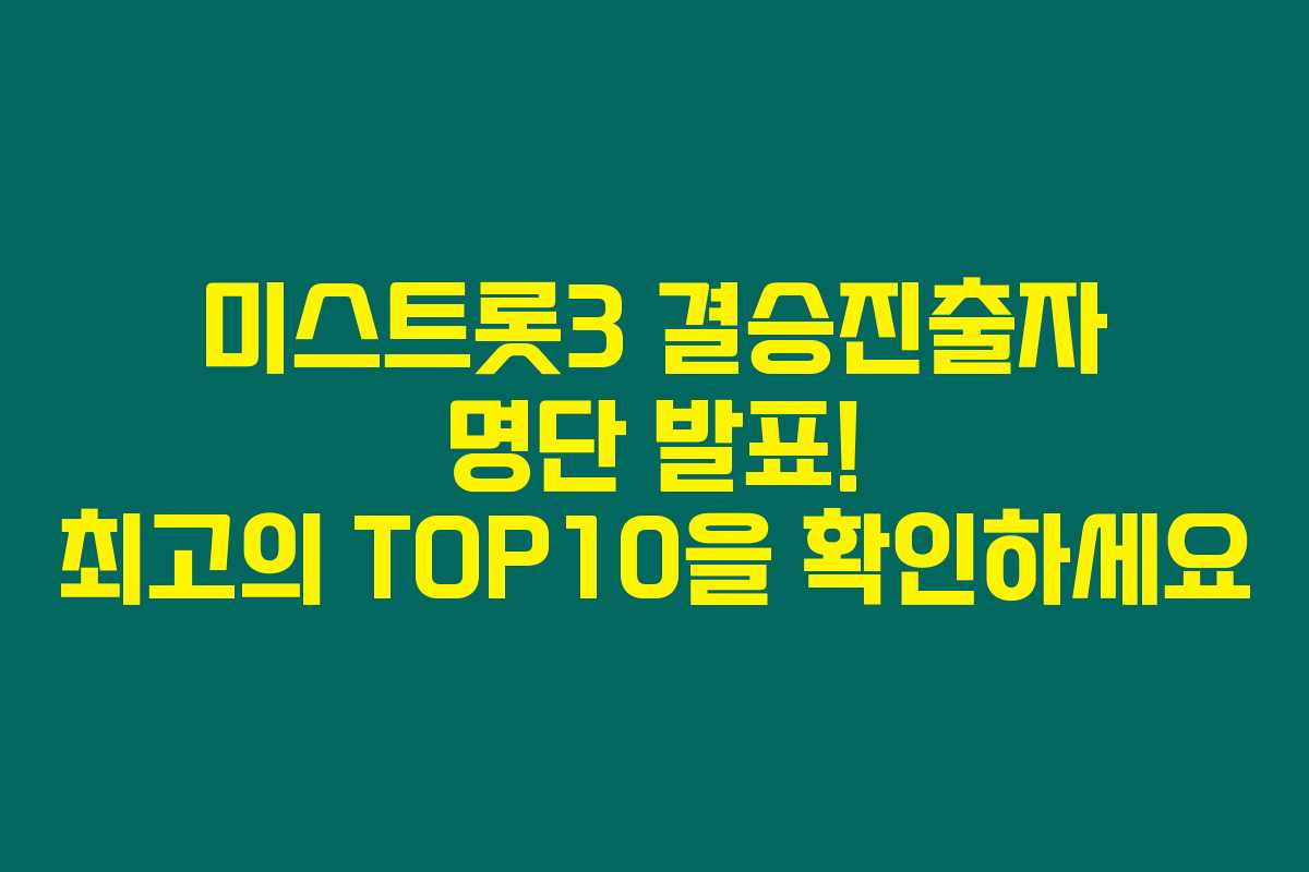 미스트롯3의 결승 진출자 명단이 드디어 공개되었답니다! 미스트롯3 TOP10 이 확정되었고 탈락자도 알려진다고 해요. 이번 시즌은 더욱 치열한 경쟁이 예상되는데요 특히 10주 연속으로 시청률 15.7%를 기록한 만큼 팬들의 기대감도 무척 크지요. 과연 누가 결승에 올라서 그 영광의 주인공이 될 것인지 한번 살펴보아요!