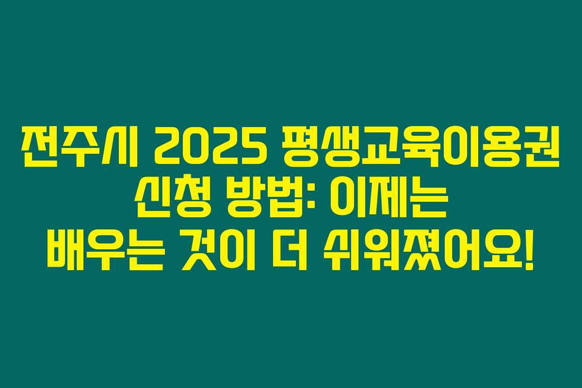 전주시의 2025 평생교육이용권 신청방법은 많은 분들에게 배움의 기회를 제공하기 위한 제도입니다. 제가 직접 체험하고 알아본 결과로는, 이 프로그램이 여러분에게 꼭 필요한 투자일 수 있다고 자신합니다. 경제적 부담 없이 꿈을 이룰 수 있는 기회를 놓치지 마세요.